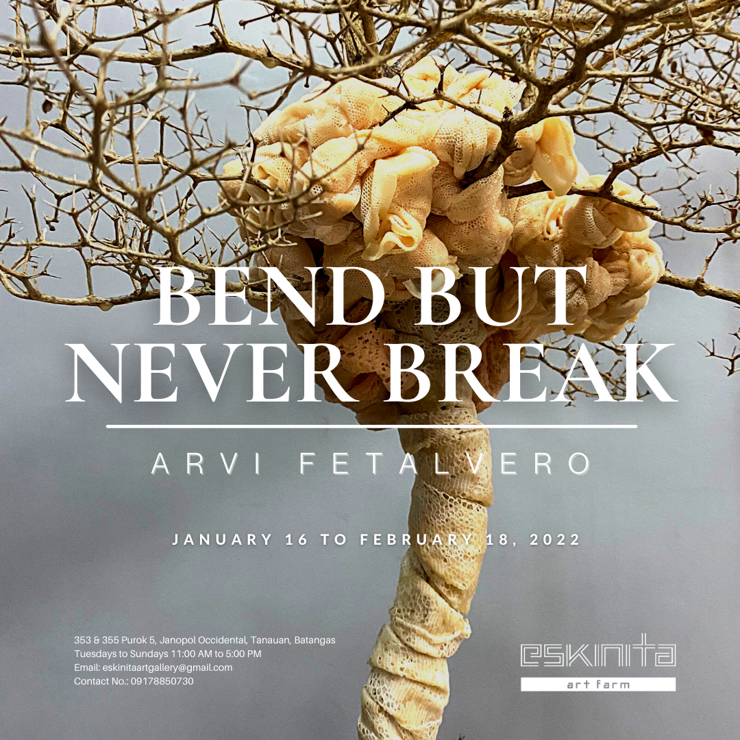 In Bend But Never Break, Arvi Fetalvero’s fourth solo exhibition, she expands on her introspection of the personal/ self as it relates and reacts to the external environment as well as internal interplay of the body, mind and soul.