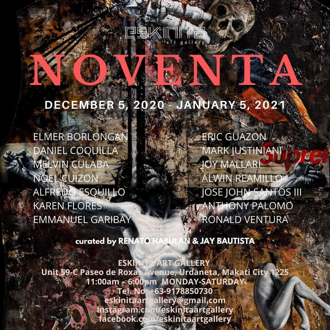 “NOVENTA”, brings together fourteen foremost artists whose passion for art began early in the 1990s and has since then created extraordinary and unique works of art. Their body of work collectively impacts and continues to contribute relevance to the art community. The show features Elmer Borlongan, Dansoy Coquilla, Melvin Culaba, Noel Cuizon, Alfredo Esquillo, Karen Flores, Emmanuel Garibay, Eric Guazon, Mark Justiniani, Joy Mallari, Alwin Reamillo, Jose John Santos III, Anthony Palomo, and Ronald Ventura. Curated by Renato Habulan and Jay Bautista.