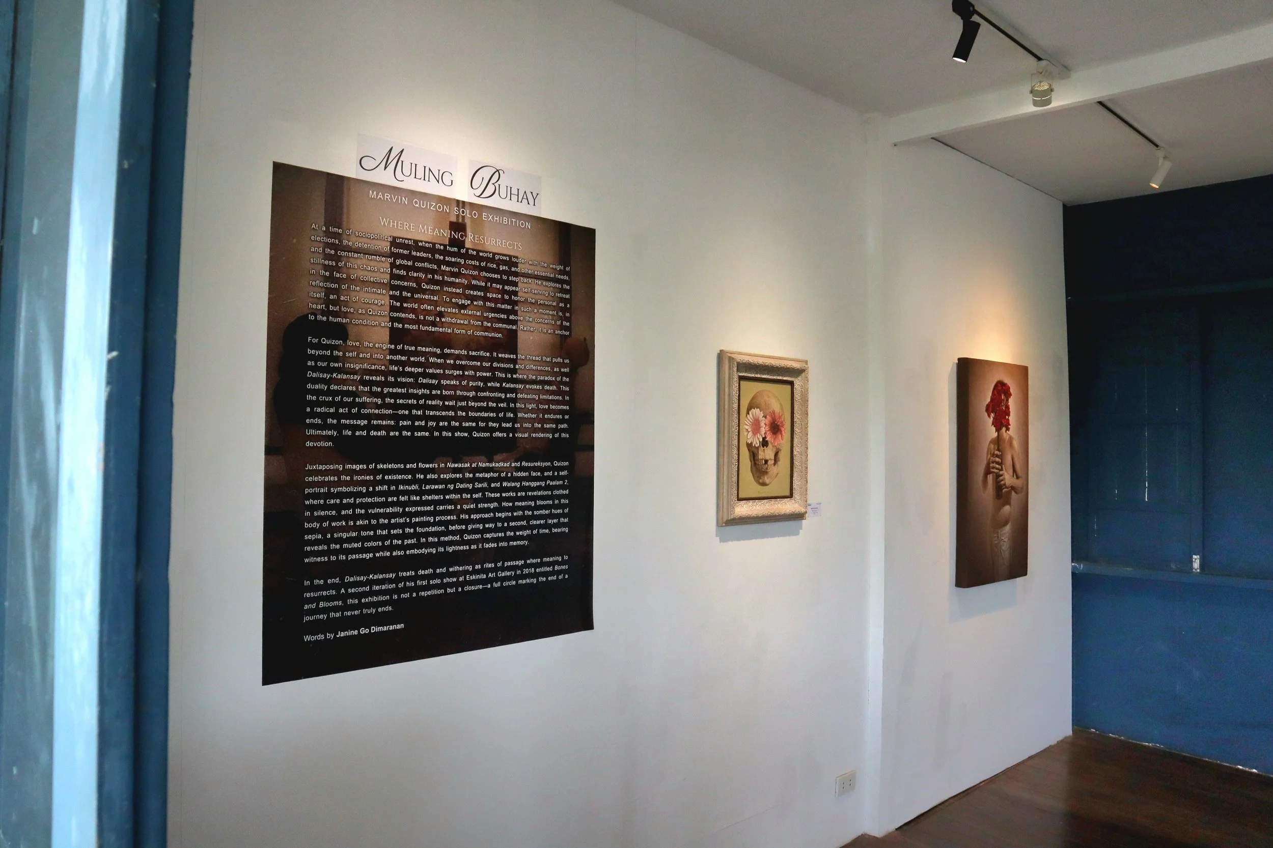 For Quizon: love, the engine of true meaning, demands sacrifice. It weaves the thread that pulls us beyond the self and into another world. This is where Muling Buhay marks its essence -- when we die and are reborn. It is also when we overcome our divisions and differences, as well as our insignificance, that life's deeper values surges with power. In the crux of our suffering, the secrets of reality wait just beyond the veil. In this light, love becomes a radical act of connection, transcending the boundaries of life. In this show, Quizon offers a visual rendering of this devotion.