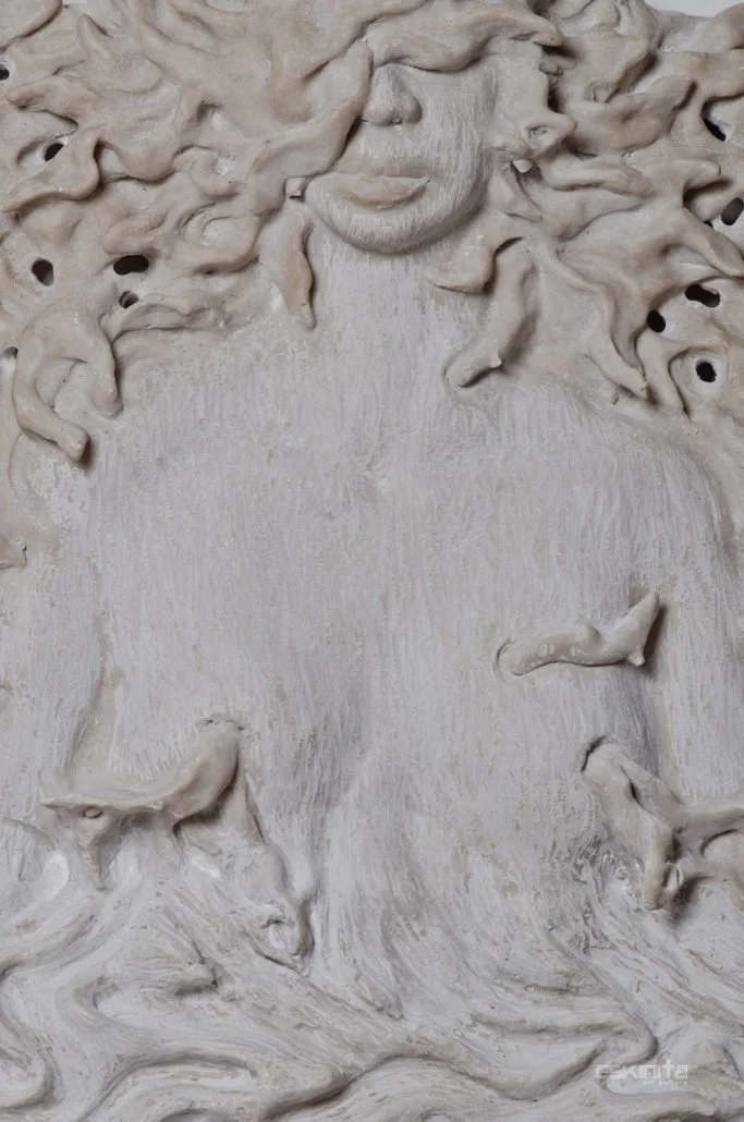 The artist presents a view of spirituality loosely based in the Judeo-Christian tradition, describing one’s soul as in need of redemption from the sufferings of this world and that divine intervention is needed in attaining spiritual wholeness. The artist invokes this view while at the same time creates his own take by altering traditional renditions. In one piece the artist depicts the trinity with a slight variation, Christ is represented by a woman’s head whose hair is transformed into a fish; this predisposition is also apparent in his usage of other common symbols from Christianity such as the image of thorny vines to depict suffering, an image of a dove representing the Holy Spirit, and the recurring image of a burning bush, from the story of Moses.