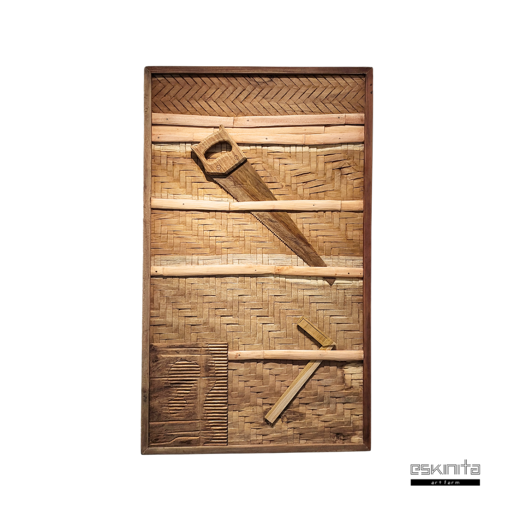 Ejar's sculptures are inspired by the "sawali" or "amakan," rigid mats made of woven bamboo strips that are commonly used as walls, partitions, or panelling in the homes of rural and informal settler families across the Philippines. These woven bamboo walls, sturdy but vulnerable to the forces of nature, are often patched up with whatever materials are readily available–cardboard boxes, pieces of plywood, corrugated iron sheets–serving not just just as barriers against the elements, but as repositories of everyday life.