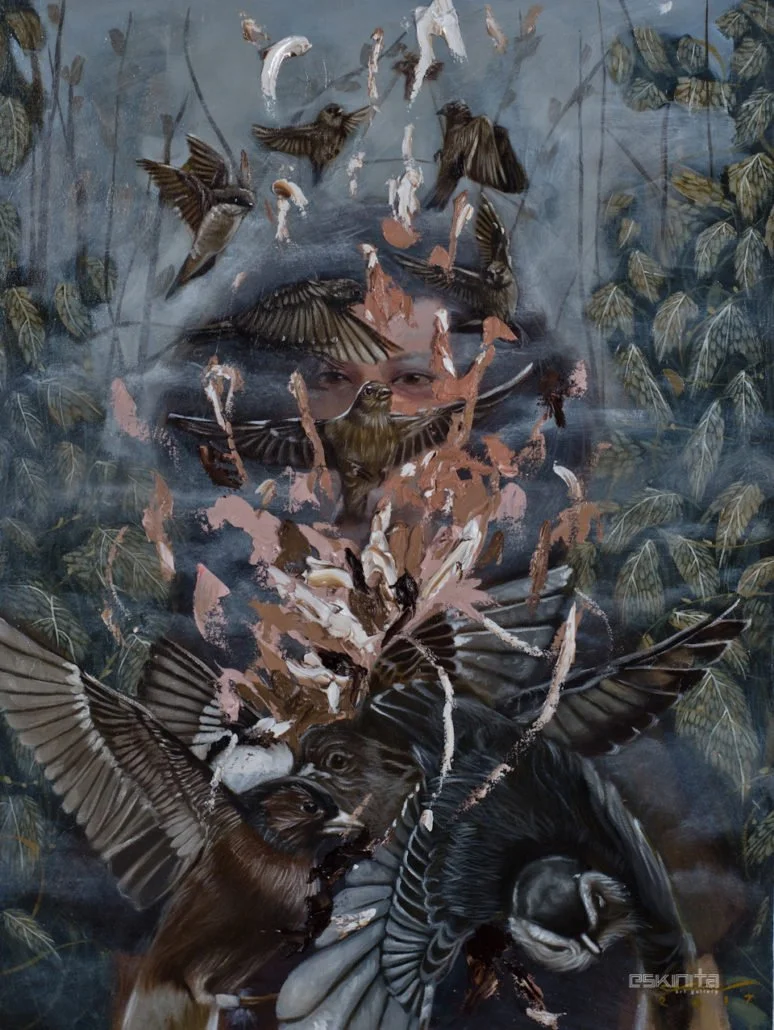 Finally, Denmark Dela Cruz and Lawrence Cervantes work in the vein of the surreal, with their works teeming with objects and beings from the natural world while attempting to capture imbalances and instabilities. Dela Cruz deals with social issues through visible dichotomies (the proletariat versus the oligarch) as well as his use of the crown, which symbolizes the deployment—and possibility—of power. Poetic and subtle, the works of Cervantes are a commentary on painting itself. He covers part of his subjects’ faces with a riot of birds and impasto applied with a palette knife in a radical act of defacement.