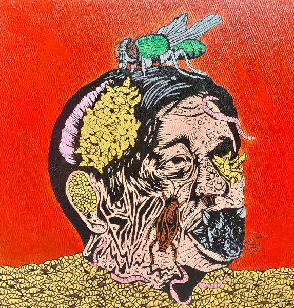 Resin, epoxy, fiber matt, pvc, sawdust, and oil on canvas