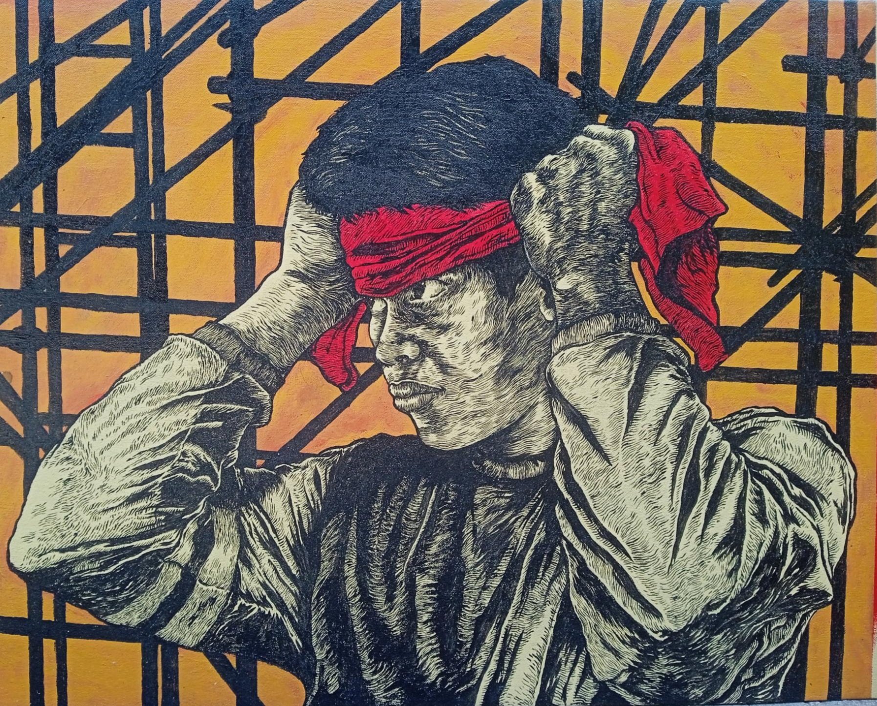 Acrylic, oil, epoxy, resin, fiber matt on canvas